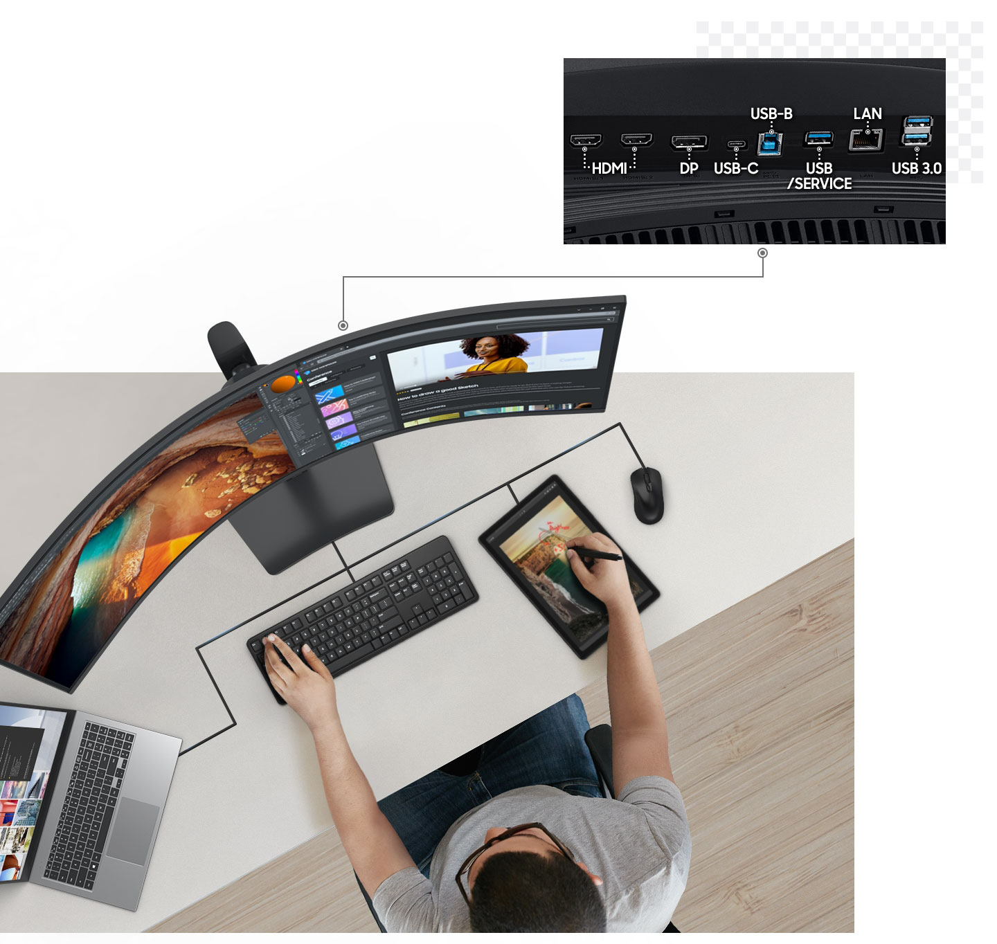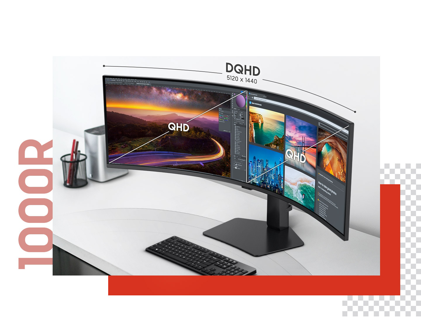 העצימו את הפרודוקטיביות בכל פרויקט. מסך קעור בגודל 49 אינץ’ וביחס רוחב 32:9 מקיף את שדה הראייה שלכם ומתאים עצמו אליו. עם תצוגת Dual QHD תוכלו לראות יותר, לעבוד בנוחות רבה יותר ולהשלים משימות ביעילות גבוהה מתמיד.