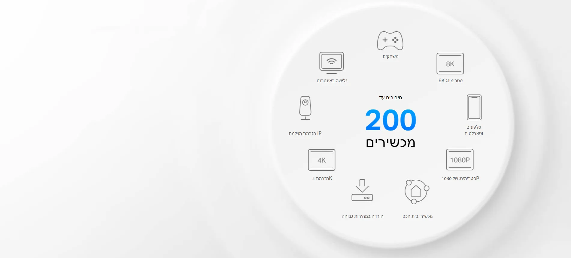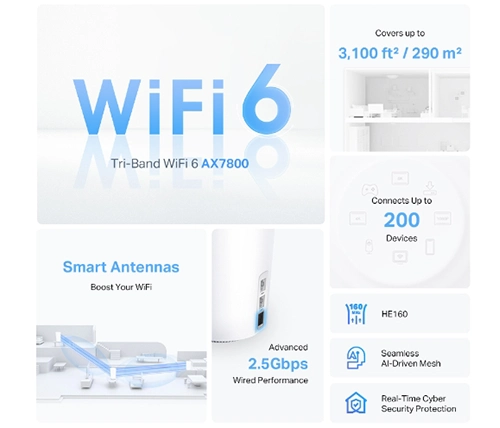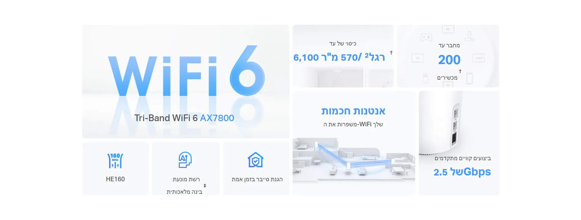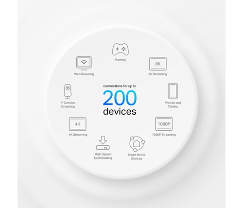 • True Tri-Band Speed - כל שלוש רצועות ה-WiFi פועלות יחד כדי לשחרר את המהירויות הכוללות של הרשת שלך עד 7,800Mbps עבור עד 200 מכשירים