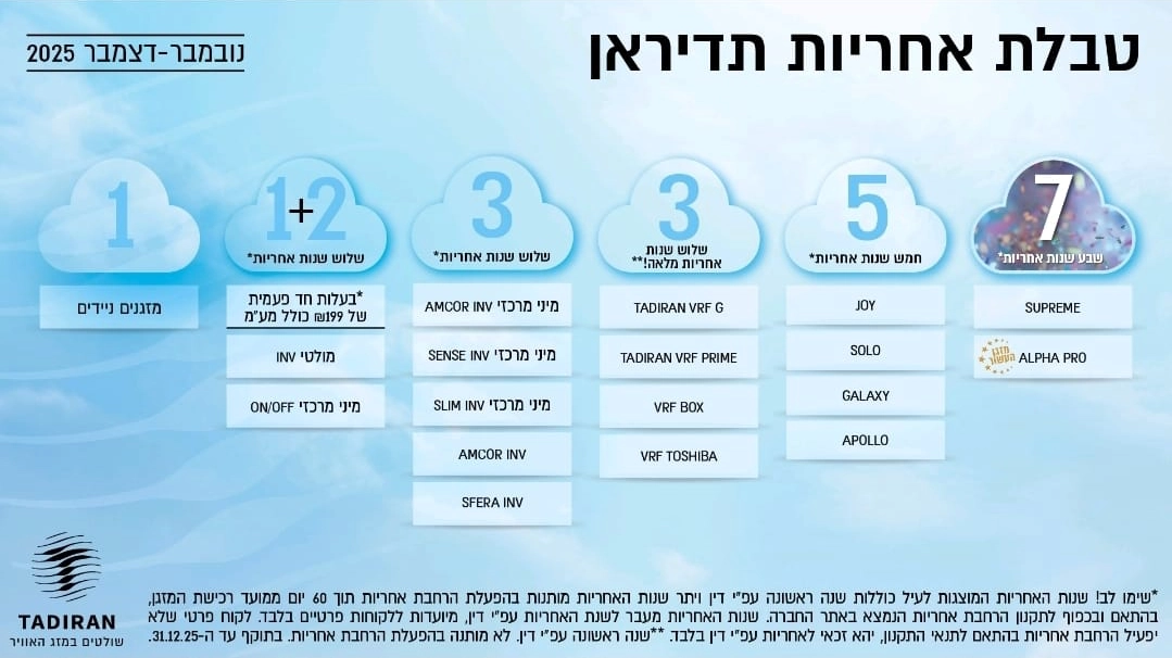 האחריות כפופה לאמור בתעודת האחריות ולתנאי היבואן. למוצרים אשר להם מעל שנה אחריות, מעבר לשנת האחריות הראשונה, האחריות מוגבלת וכפופה לאמור בתעודת האחריות ולתנאי היבואן