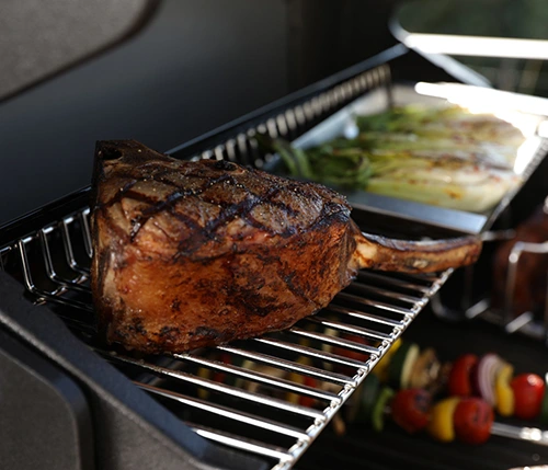 לגריל משטח צלייה רחב (2,772 ס”מ) עשוי מרשתות בעלות פטנט ייחודי לצלייה בשלושה מצבים (בהתאם לרמות השומן של הבשר); מערכת בישול ™Flav-R-Wave שמספקת פיזור חום מעולה, מגנה על המבערים ומאדה את השומן והנוזלים המטפטפים בחזרה לבשר; ארבעה מבערי נירוסטה חדשניים בטכנולוגיית DUAL TUBE ומבער אחורי לשיפוד מסתובב בעוצמת מבערים כוללת של 64,000 BTU; כירת צד לבישול וטיגון תוספות ושיפוד רוטיסרי חזק לנתחי בשר גדולים.