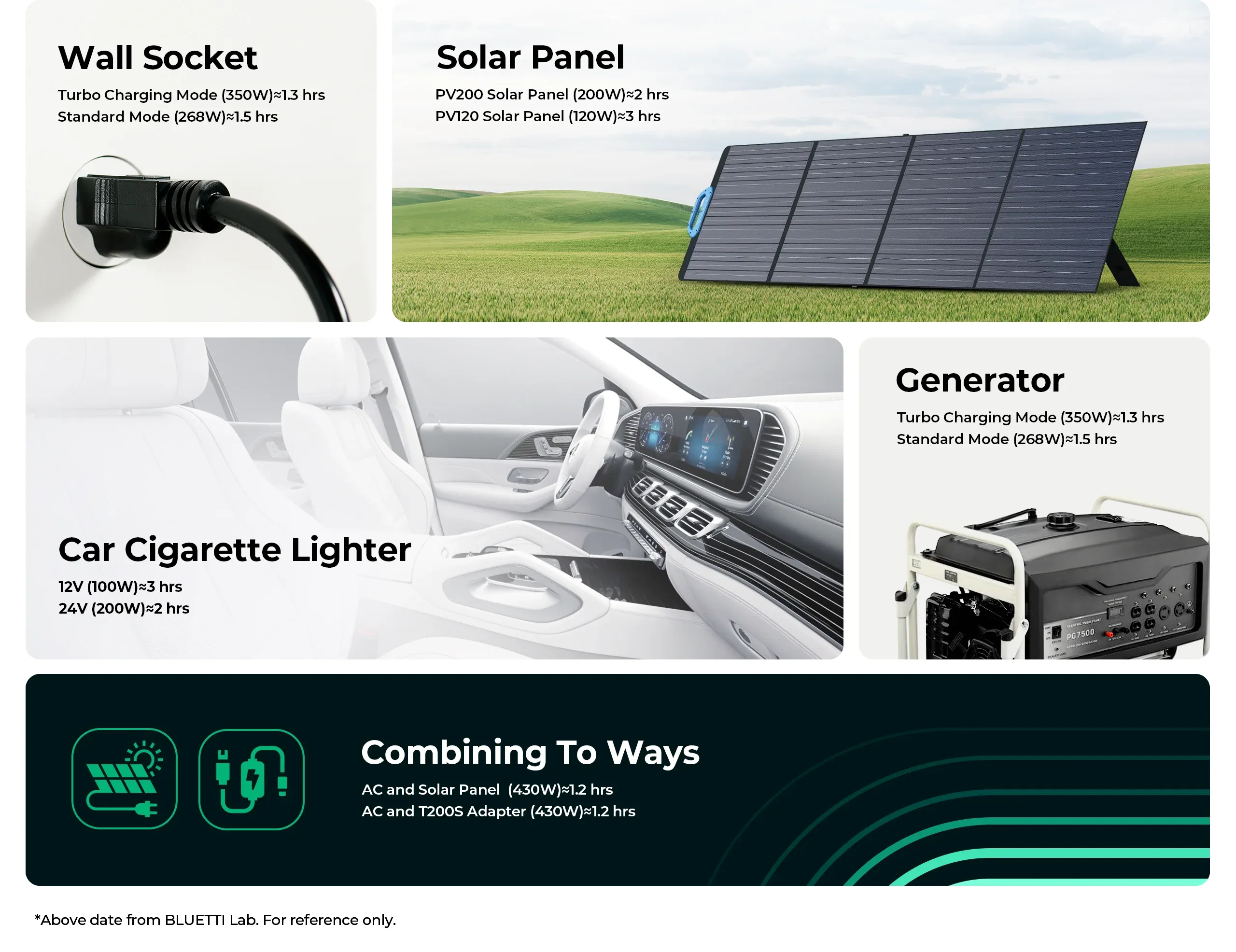 מקמפינג קרוואנים ועד לחקר השממה ללא חשש להתנתק ממקור אנרגיה זמין. ניתן להטעין את BLUETTI EB3A במגוון דרכים, באמצעות AC, פאנלים סולאריים, מכונית, גנרטור, AC+Solar, או AC+Adapter.
