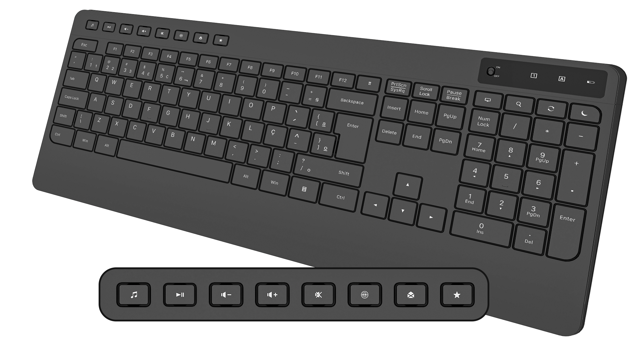 8 כפתורי מולטימדיה (לשליטה על ניגון מדיה, שליטה על הווליום ועוד...), 109 כפתורים שקטים, כולל כפתור כיבוי והפעלה עבור חיסכון בסוללות המקלדת.