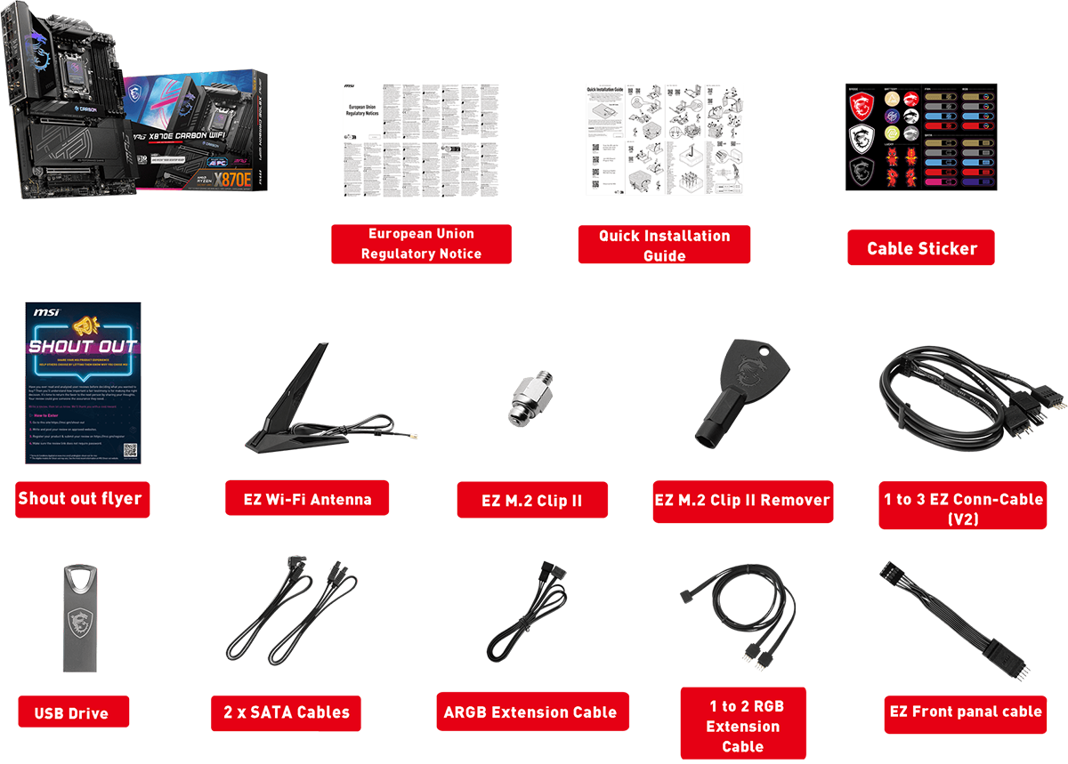 לוח אם MSI MPG X870E CARBON WIFI, ערכת שבבים X870E, תושבת מעבד AM5, כולל קישרויות אלחוטית Wi-Fi 7 ו-Bluetooth 5.4, כולל כרטיס רשת קווי Realtek 5Gb, חיבורים USB-C 4.0 ו-USB 3.2 Gen2