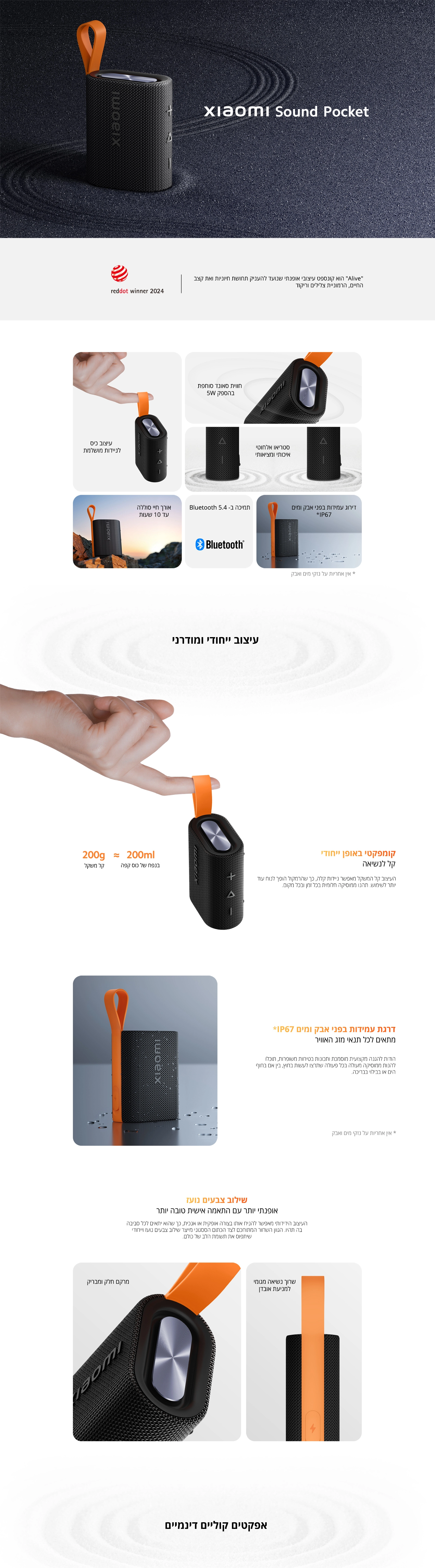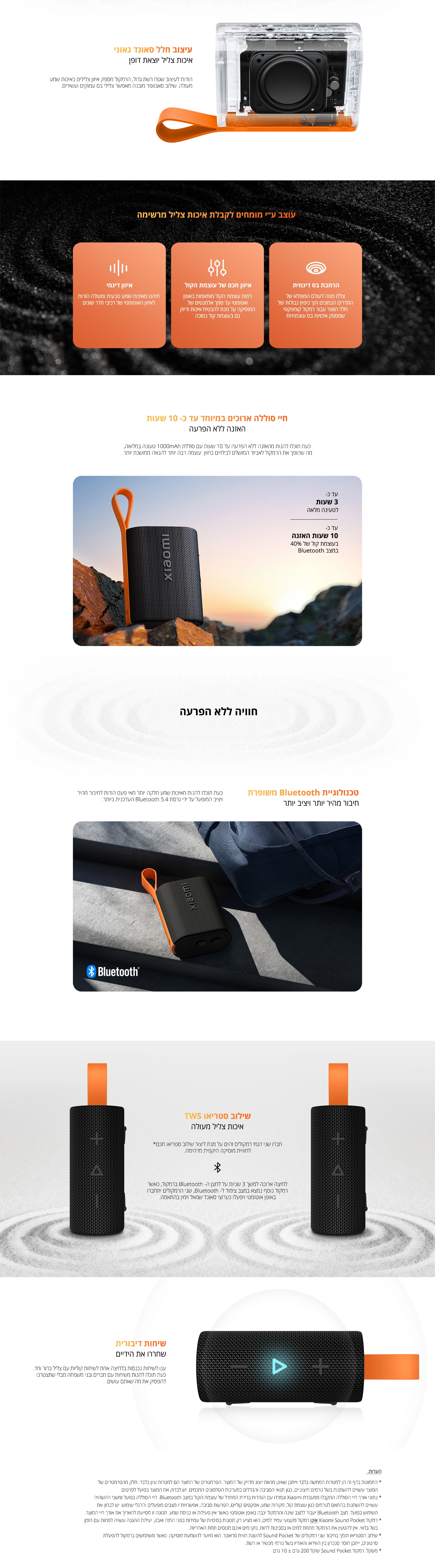 הרמקול האלחוטי הקומפקטי והנייד Xiaomi Sound Pocket, בהספק של 5W, מגיע עם אפשרות לצימוד סטריאופוני של שני רמקולים. הרמקול מצויד בבלוטות' ומוגן מפני מים ואבק בתקן IP67, מה שהופך אותו לעמיד במים. בנוסף, יש לו מיקרופון מובנה לשיחות, והוא מספק עד 10 שעות ניגון