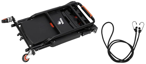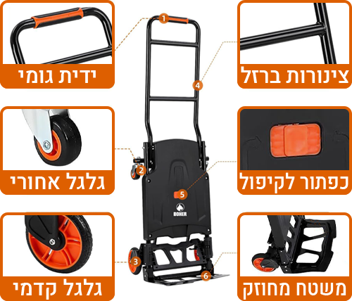 לעגלה ידית גומי נוחה לאחיזה, צינורות ברזל וגלגלים עמידים (עבור מצב שוכב ועומד), ומשטח מחוזק עבור עבודה יעילה בטיחותית ונוחה.
