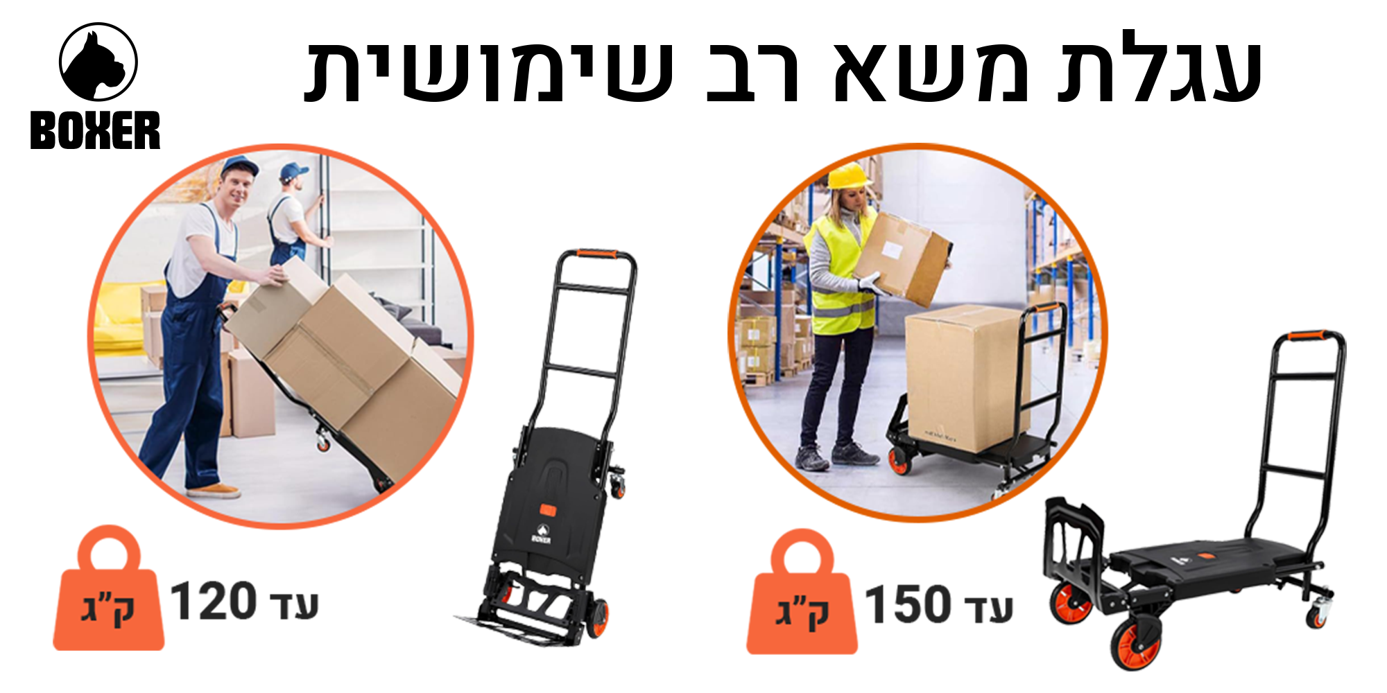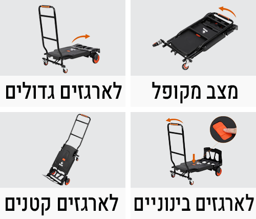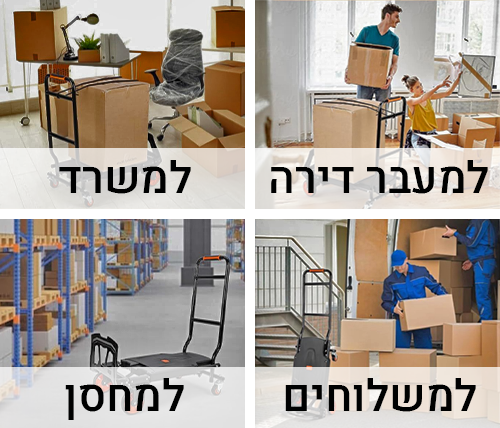 העגלה גם מתאימה לנשיאת ושנוע ציוד מהרכב, מעברי דירה, משלוחים וכמו כן, סדר וארגון של מחסנים ומשרדים.