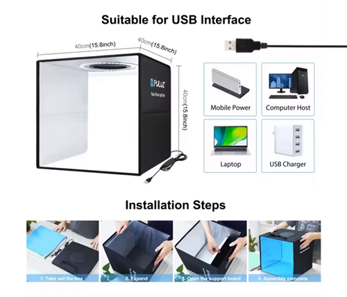 אוהל צילום נייד מתקפל עם תאורה PULUZ כולל שלט חוטי עם חיבור USB