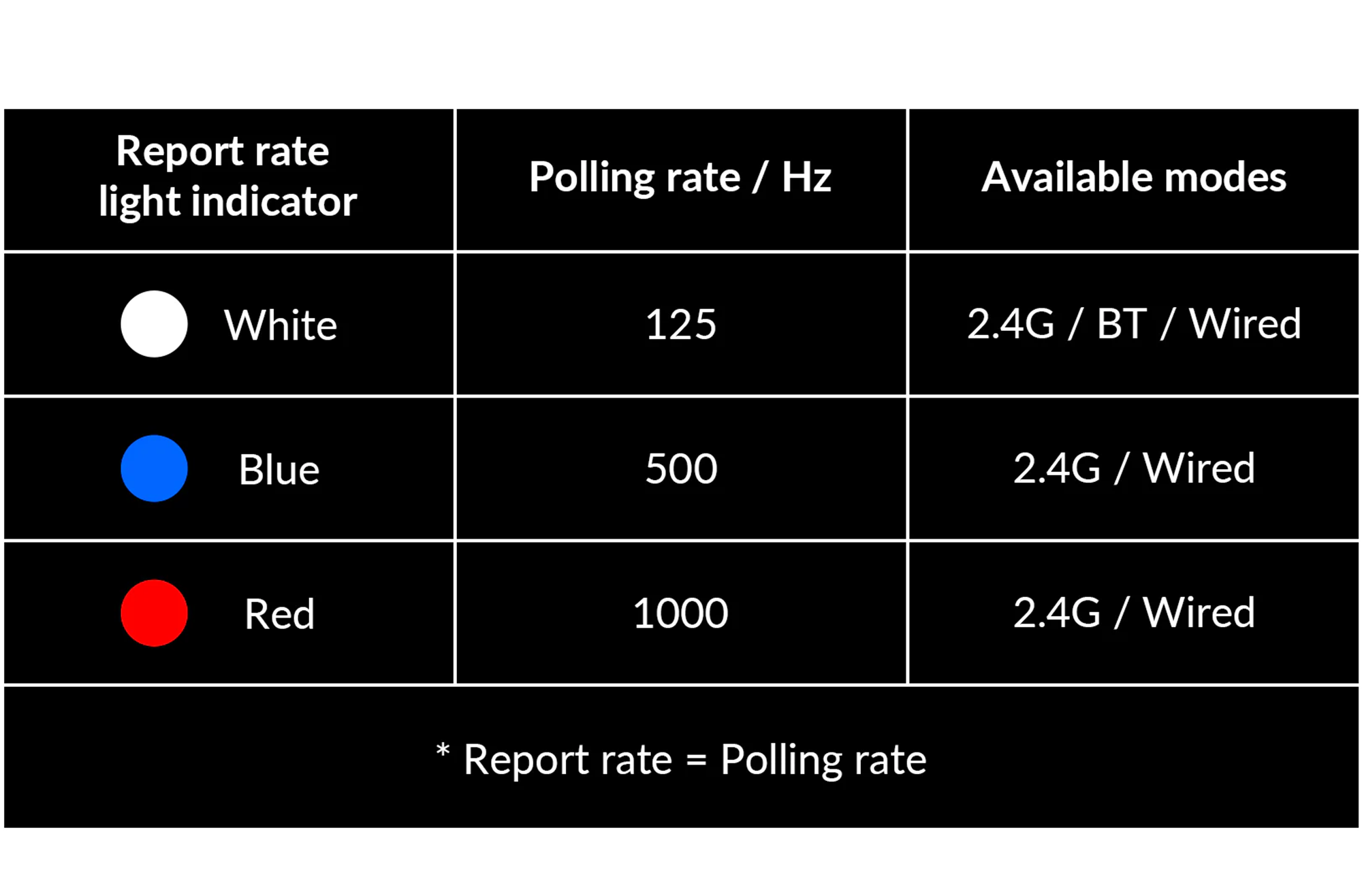 לחץ על כפתור קצב הדיווח (Report Rate) כדי לעבור בין 3 רמות של קצב דגימה (polling rate) מ-12 Hz ועד 1000Hz במצב 2.4GHz אלחוטי או חוטי.