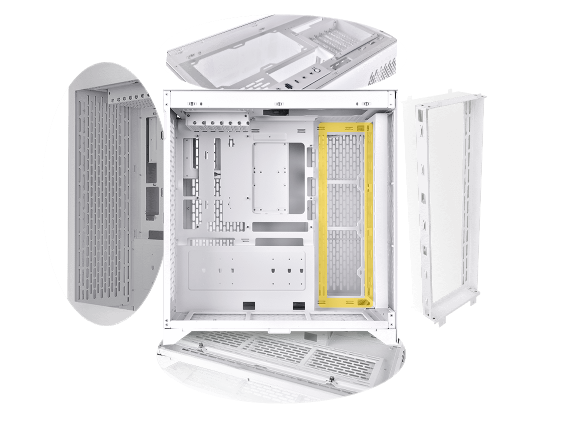 צד שמאל כולל פאנל זכוכית מחוסמת בעובי 4 מ"מ, להצגת החומרה הפנימית. בנוסף, קיימות שתי אפשרויות לפאנל קדמי: זכוכית מחוסמת או פאנל מאוורר (מחורר) — לבחירה בין מראה יוקרתי לזרימת אוויר משופרת.