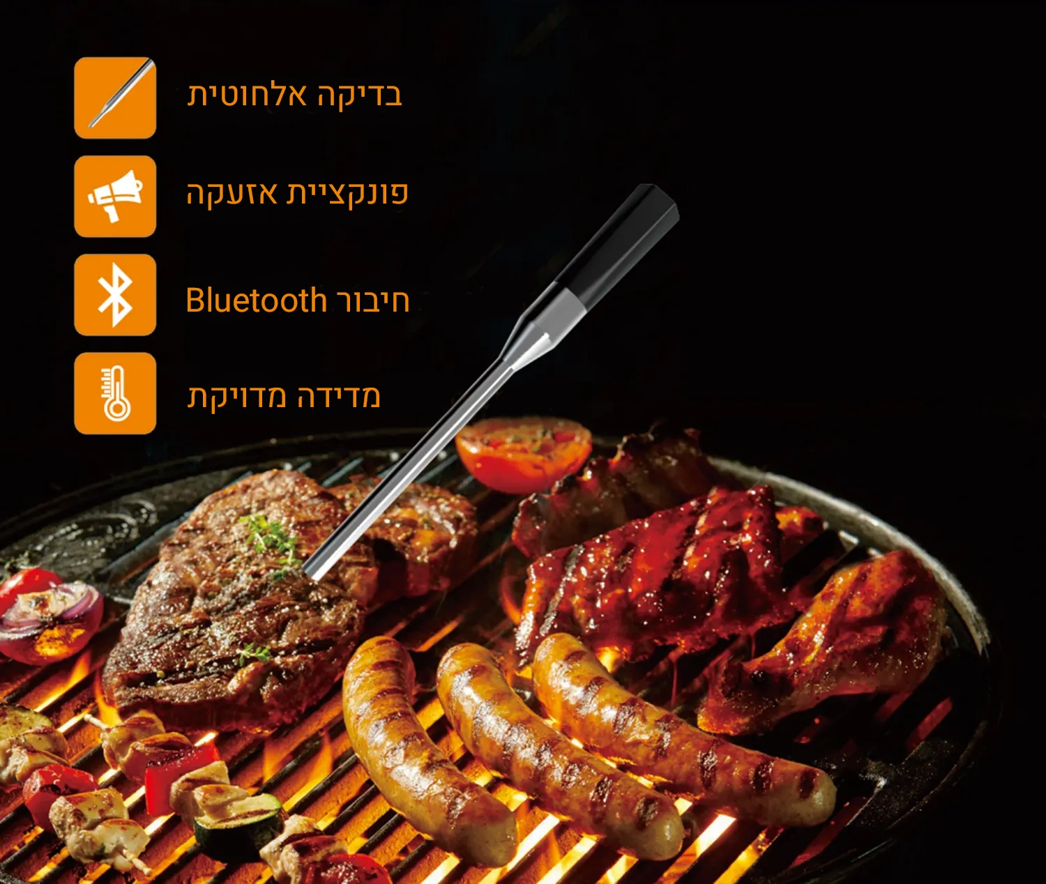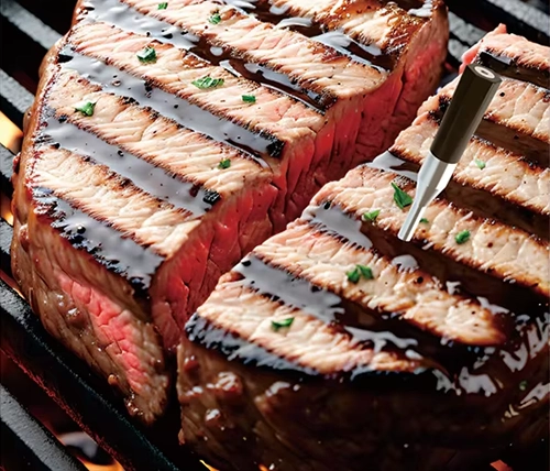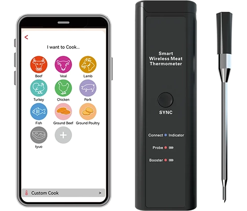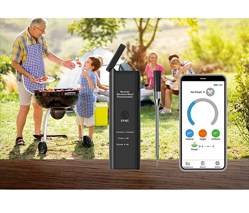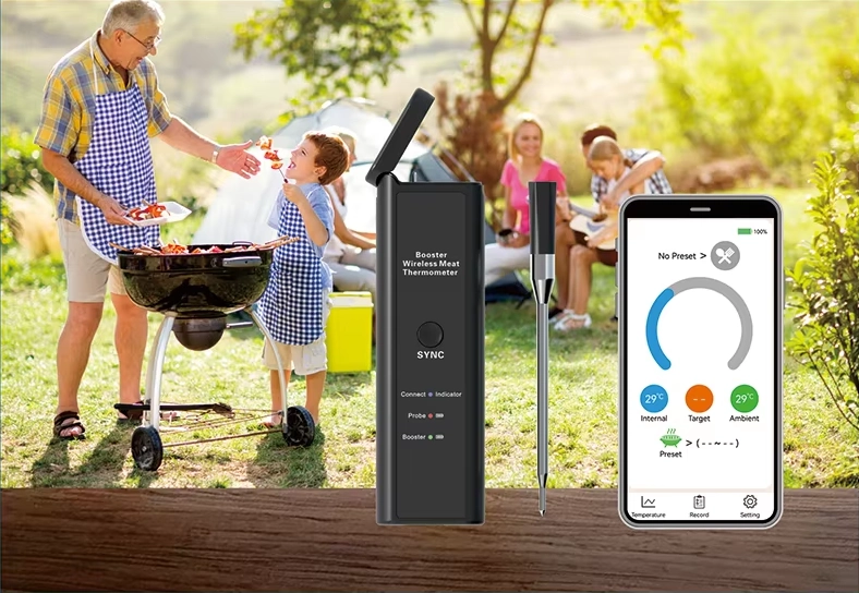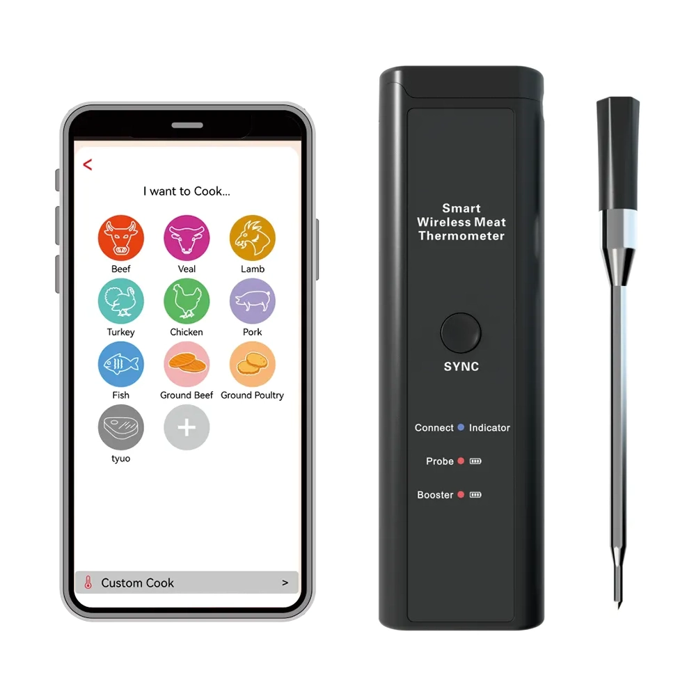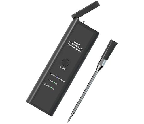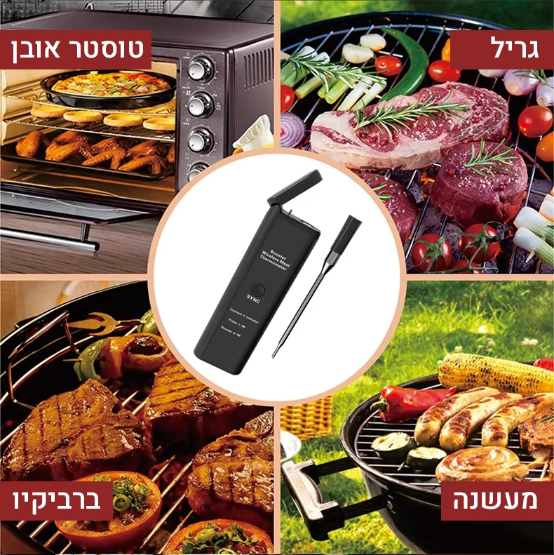מדחום דיגיטלי אלחוטי חכם למטבח, עמיד במים ואידיאלי לצלייה, בישול בתנור ועישון בשר. מספק מדידה מדויקת של טמפרטורת הבשר הפנימית וטמפרטורת הסביבה, כולל סוללה נטענת ותמיכה באפליקציה חכמה