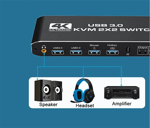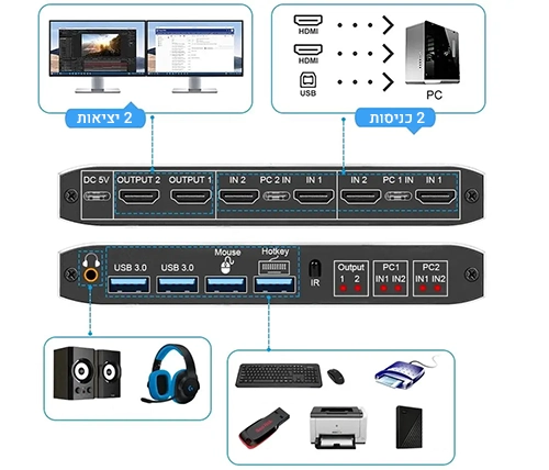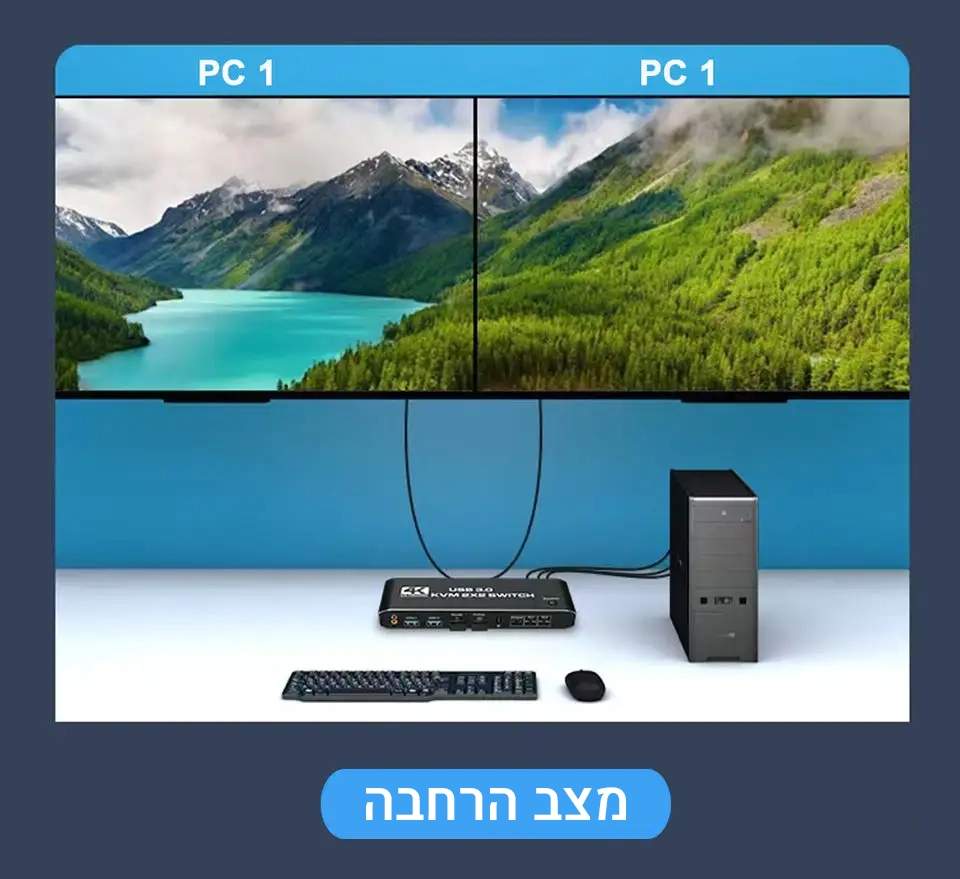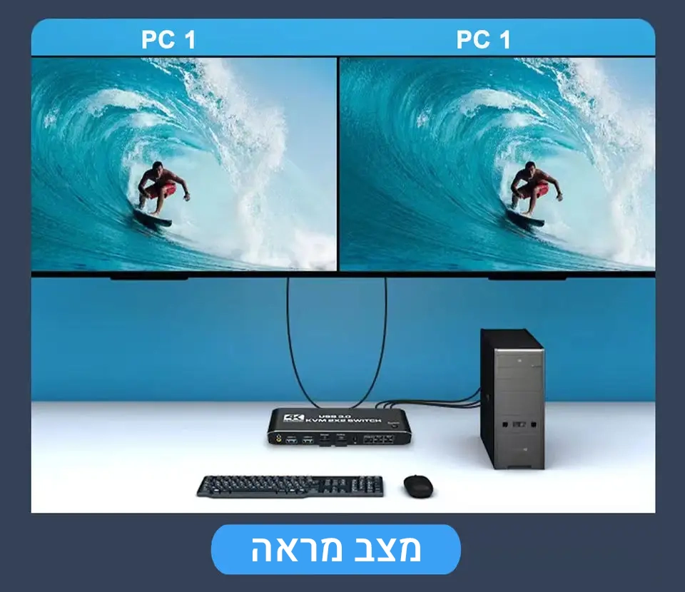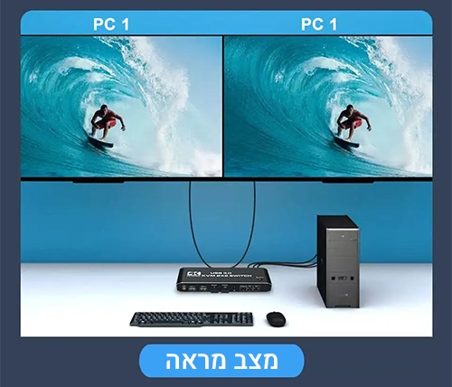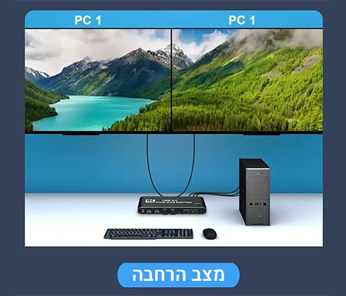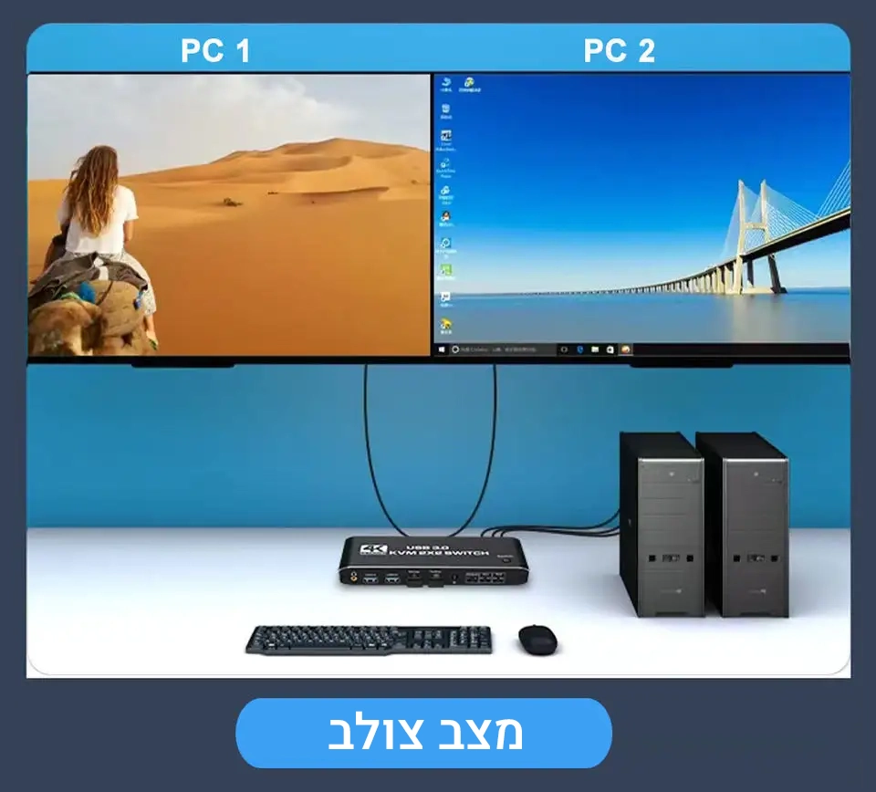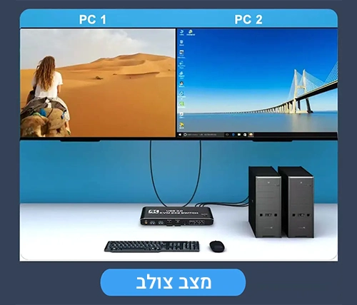 מתג KVM זה מאפשר שיתוף של שני מסכים בין שני מחשבים, מה שהופך אותו למושלם עבור משתמשים הזקוקים לניהול מספר מכשירים מתוך קונסולה אחת, כמו אנשי IT, גיימרים, ועובדי משרד.