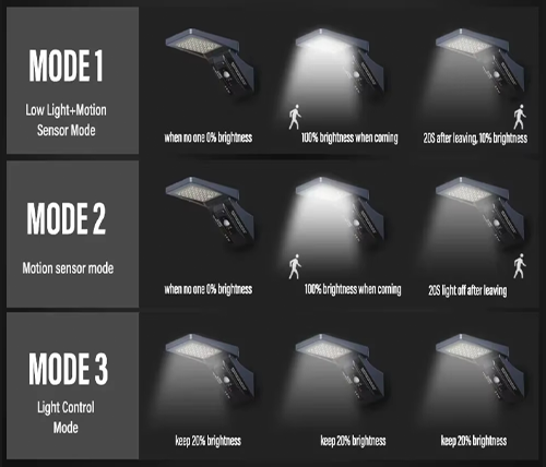 1. אור חלש וזיהוי תנועה, הפעלת תאורה ב-100% והמנחה לאחר עזיבה.