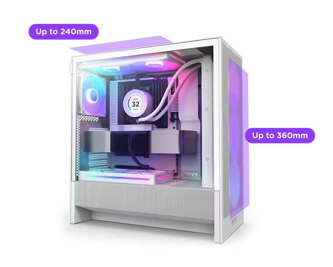 מארז מחשב NZXT H5 Flow RGB בצבע לבן, כולל 3 מאווררי 12 ס"מ RGB ומאוורר נוסף 12 ס"מ אחורי, עם תמיכה בקירור נוזלי עד 360 מ"מ