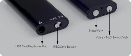 מכשיר הקלטה דיגיטלי קומפקטי עם פרופיל דק ביותר. מגיע עם זוג אוזניות. למכשיר ההקלטה פרופיל קומפקטי שמתאים להקלטה סמויה. כמו גם, מחבר PL עבור טעינה, העברת נתונים למחשב והאזנה לקבצי MP3. ניתן גם להשתמש במכשיר ההקלטה כמו זיכרון USB נייד. מכשיר ההקלטה מגיע עם כפתורים להפעלה/כיבוי, הקלטה, האזנה ושליטה על הווליום וזוג אוזניות.