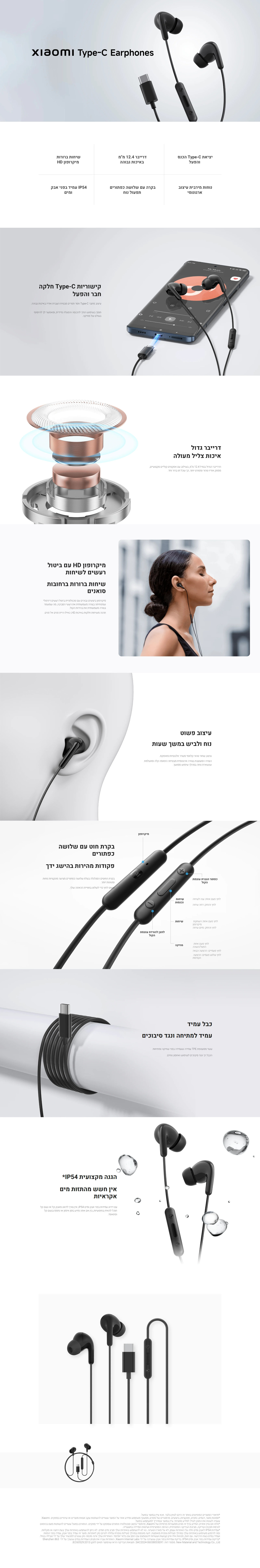 אוזניות Xiaomi Type-C Earphones עם יציאת Type-C מאפשרות חיבור והפעלה מיידיים. הן מספקות סאונד איכותי עם דרייבר בגודל 12.4 מ"מ ומיקרופון HD לשיחות ברורות. העיצוב הארגונומי מספק נוחות, ויש בהן בקרת כבל עם שלושה כפתורים. האוזניות עמידות בפני מים ואבק בדרגת IP54