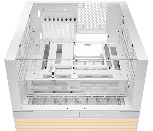 בנוסף לרדיאטורים שניתן להתקין בחלק העליון והתחתון, ניתן להתקין רדיאטור נוסף באורך של עד 360 מ"מ בצד – מה שמאפשר שילוב של שלושה רדיאטורים! בנוסף, Light Base 900 DX White מגיע עם שני רכזות ARGB ו-PWM הכוללות יחד 12 חיבורים. מיקומם בחלק העליון והתחתון מאפשר חיבור נוח של החומרה שלכם.