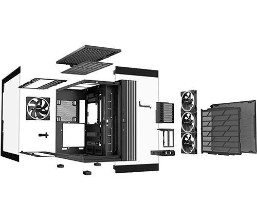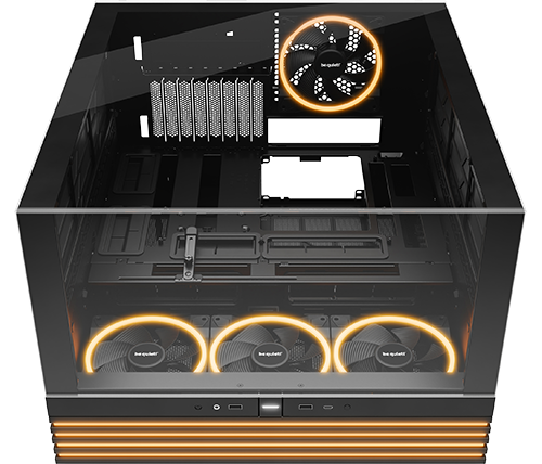 Light Base 900 FX Black מגיע כולל 4 מאווררים מותקנים מראש, אך ניתן להתקין בו עד 10 מאווררים בסך הכול, מה שהופך אותו לגמיש במיוחד. עם עיצוב מרווח, הוא יכול להכיל שני רדיאטורים של 420 מ"מ בו זמנית, לוח אם בגודל E-ATX ואפילו את כרטיסי המסך העוצמתיים ביותר. הודות לעיצוב תא כפול, הכוננים והכבלים מסודרים בחלק האחורי ואינם מפריעים לזרימת האוויר.
