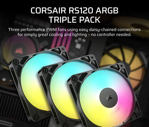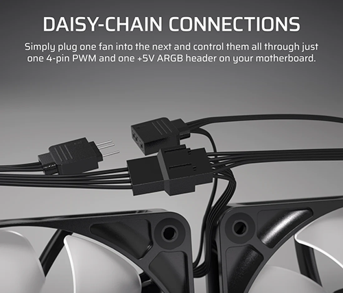 דלגו על רכזות מאווררים וכבלים מיותרים – חברו בשרשור את מאווררי סדרת RS ARGB ברצף ושלוט בכולם דרך מחבר 4 פינים PWM אחד ומחבר +5V ARGB אחד בלבד ישירות מהלוח האם.