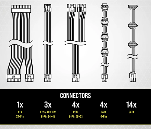 כבלים מודולריים לחלוטין פירושם שאתם מחברים רק את הכבלים שהמערכת שלכם צריכה, ומגוון הכבלים הכלולים מוסיף תאימות רחבה לכרטיסי מסך ולוחות אם מודרניים.