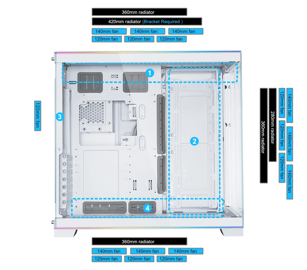 ה-O11D EVO RGB מעט גדול יותר מה-O11D EVO, ומספק תאימות גבוהה יותר לרכיבים: תומך ברדיאטור בגודל 360 מ"מ למעלה, בצד ולמטה או ב-3 מאווררי 140 מ"מ בכל אחד משלושת הצדדים