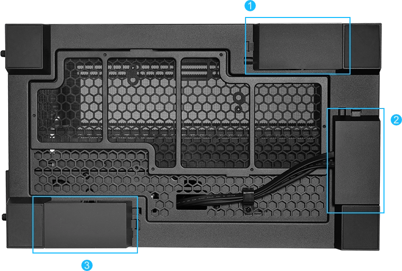 תושבת ההתקנה של ספק הכוח בולטת גם היא ב-15 מ"מ מחלקו האחורי של המארז, ומוסיפה מקום נוסף לניהול כבלים. בנוסף, יש נקודת קשירת כבלים בגב המארז, אשר מסייעת בארגון כבלי ה-I/O האחוריים.