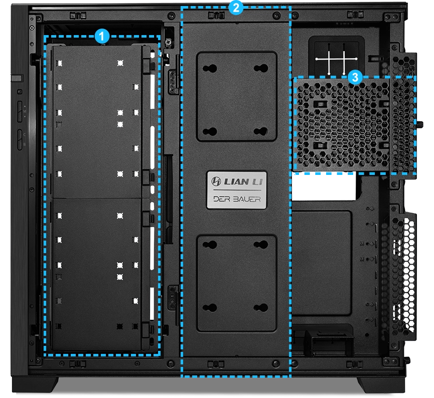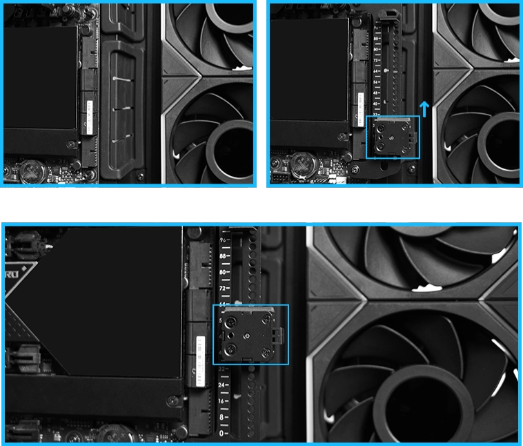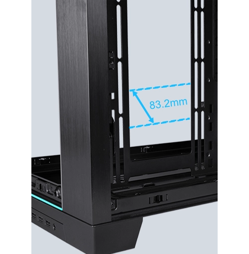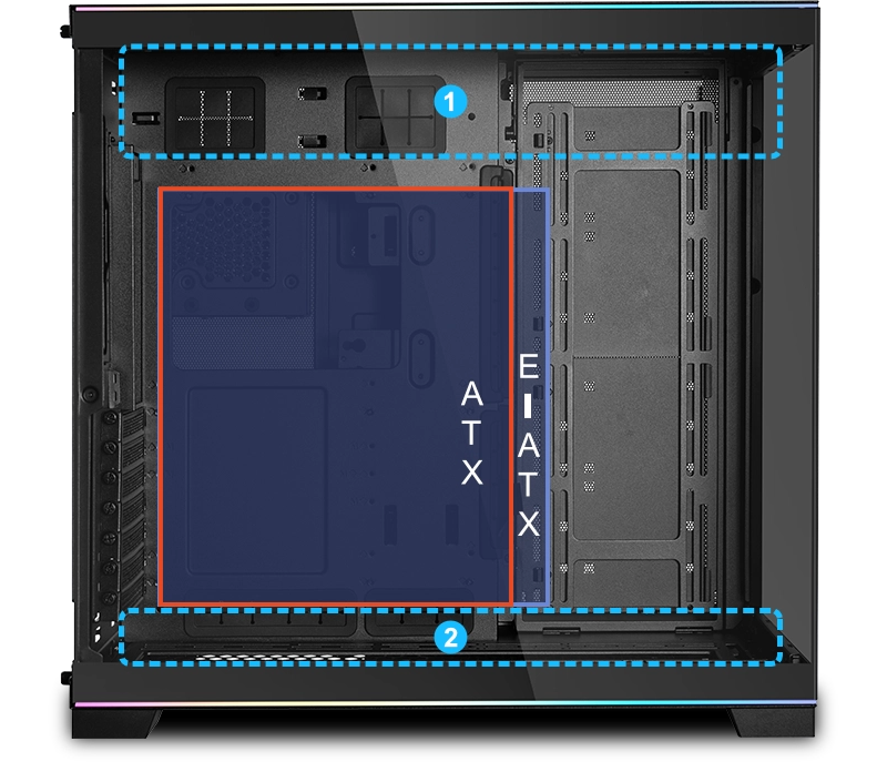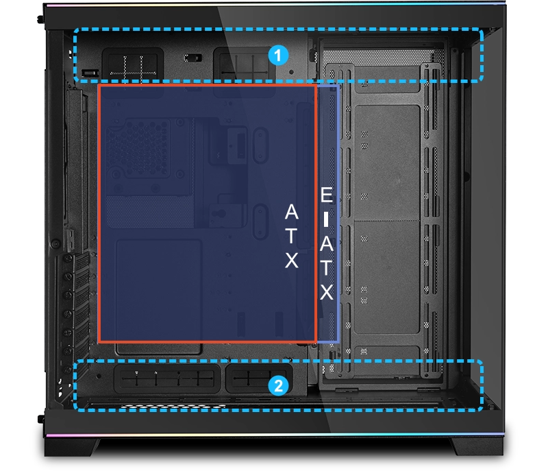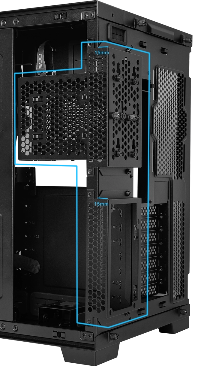 המרחק בין מיקומי ההתקנה בצד שמאל וימין הוא 20 מ"מ, כך שמשתמשים עם לוחות אם מסוג E-ATX יכולים לבחור בהתקנה מצד ימין כדי למנוע חסימת מאווררים וליהנות משטח ניהולי נוסף לכבלים. בנוסף, המארז כולל גומחת פינה אנכית חדשה לניהול כבלים נוח גם עם לוח אם גדול.