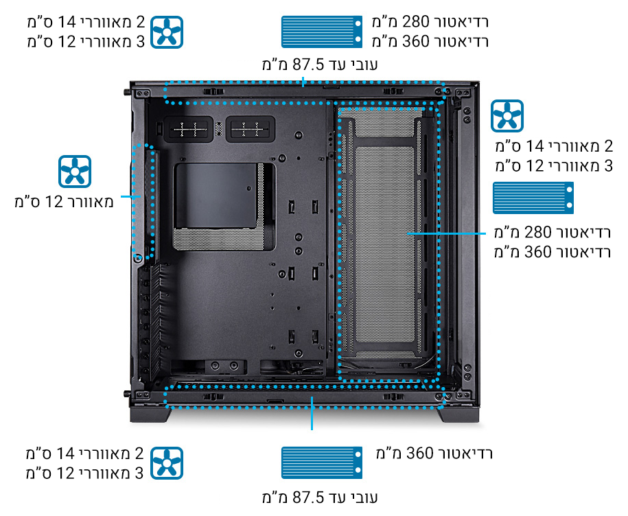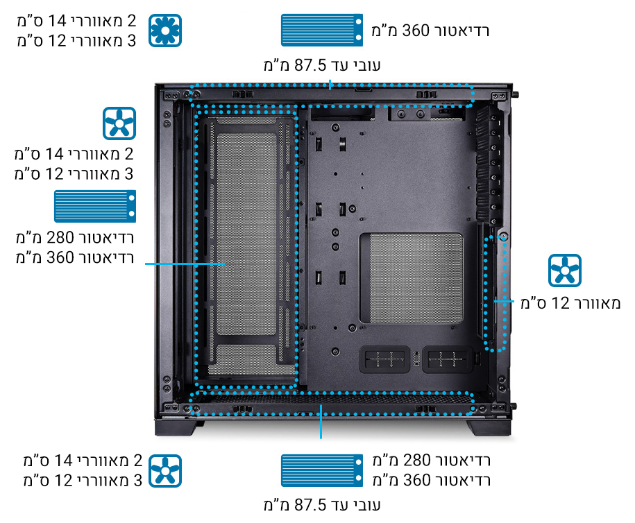 המארז תומך ב-3 רדיאטורים של 360 מ"מ, ועד 10 מאווררים.