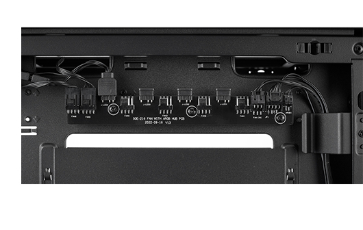 בתא השני מאחורי לוח האם, קיימת רכזת מאווררים עם חיבור SATA שיכולה לתמוך בעד 4 מאווררי ARGB ו-PWM.