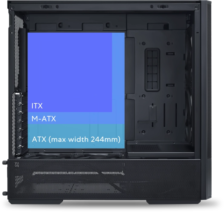 ה-LANCOOL 207 תומך בלוחות אם מסוג ATX רגיל (רוחב מקסימלי 244 מ"מ) / M-ATX / ITX.