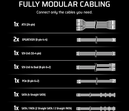 כולל כבלי GPU בתקן PCIe 5.1 12V-2x6 לשימוש עם כרטיסי מסך מודרניים ועתידיים.