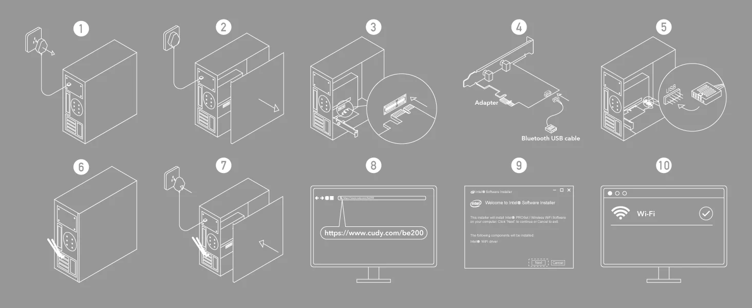 ה-Wi-Fi וההספק דורשים חריץ PCI-E מסוג 1x, 4x, 8x או 16x בלוח האם. פונקציית ה-Bluetooth דורשת חיבור USB של 9 פינים בלוח האם.