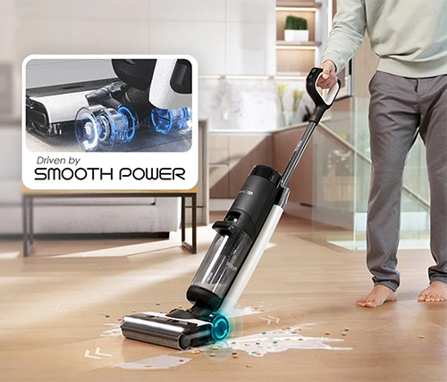 Tineco FLOOR ONE S7 FlashDry שוטף, שואב ומייבש את הרצפה באופן מיידי לניקוי יסודי ללא סימנים, עם מערכת הנעה עצמית SmoothPower לתנועה קלה, ניקוי עצמי מהיר (2 דקות שטיפה + 5 דקות ייבוש), חיישן iLoop להתאמת מים וסוללה אוטומטית, והגעה עד 1 ס"מ מהקצה לניקוי פינות.