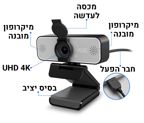 כוללת מיקרופונים מובנים ומכסה פרטיות. מתאימה לשיחות וידאו, זום, שיעורים מקוונים וסטרימינג.