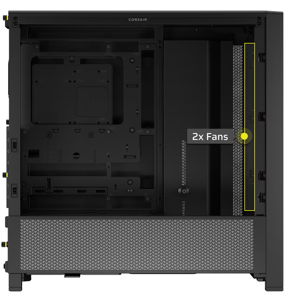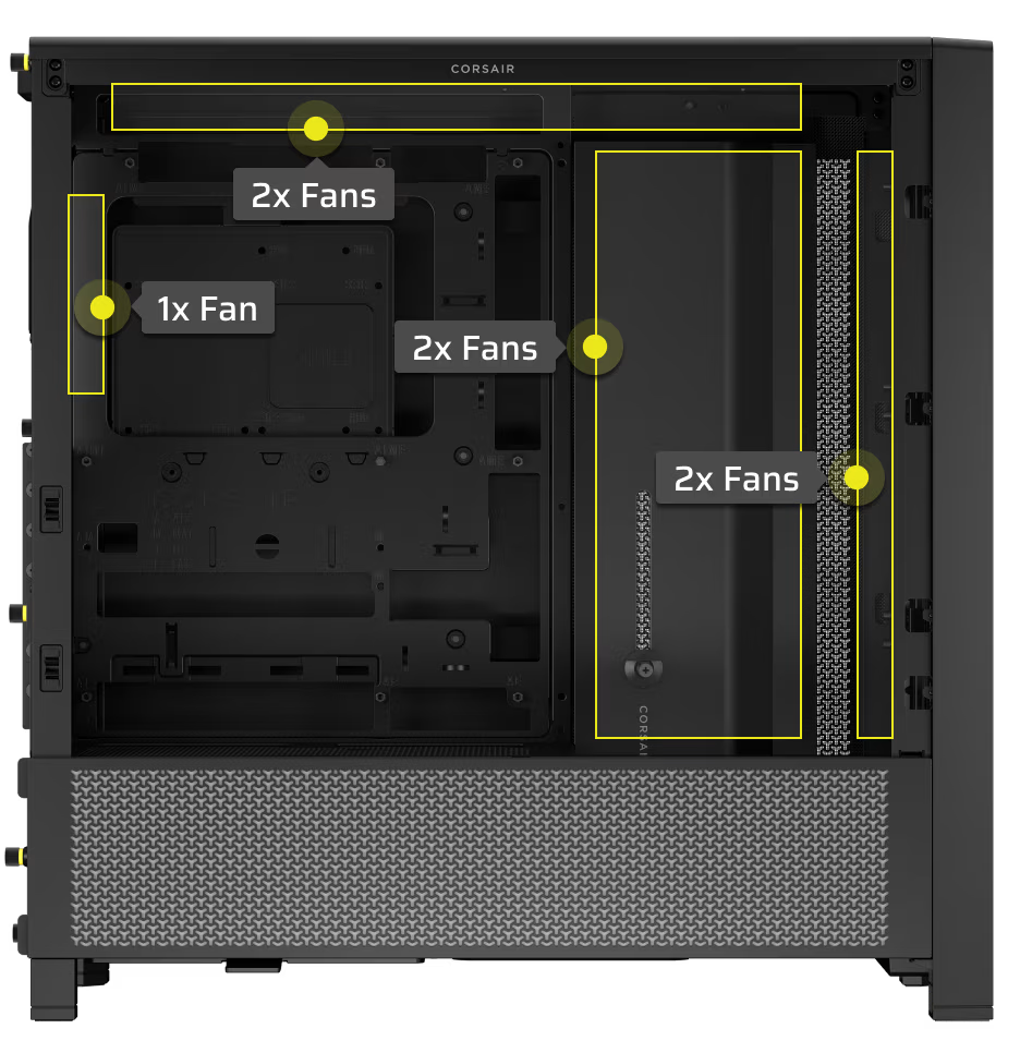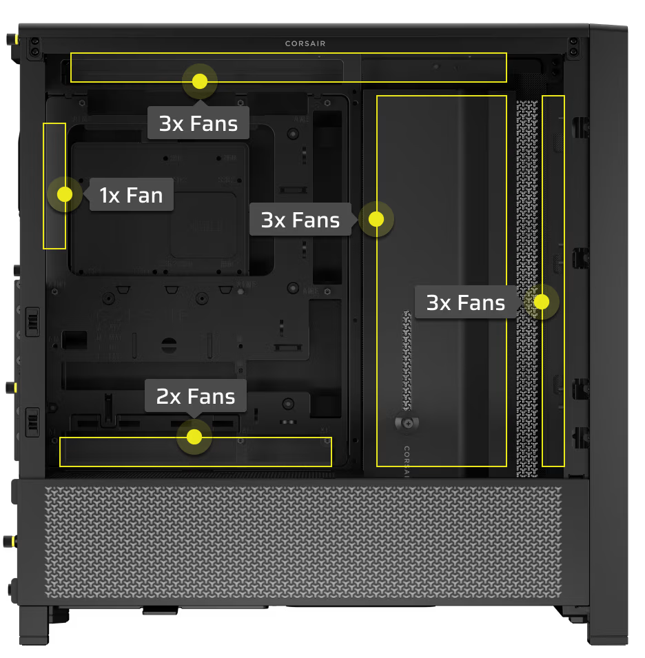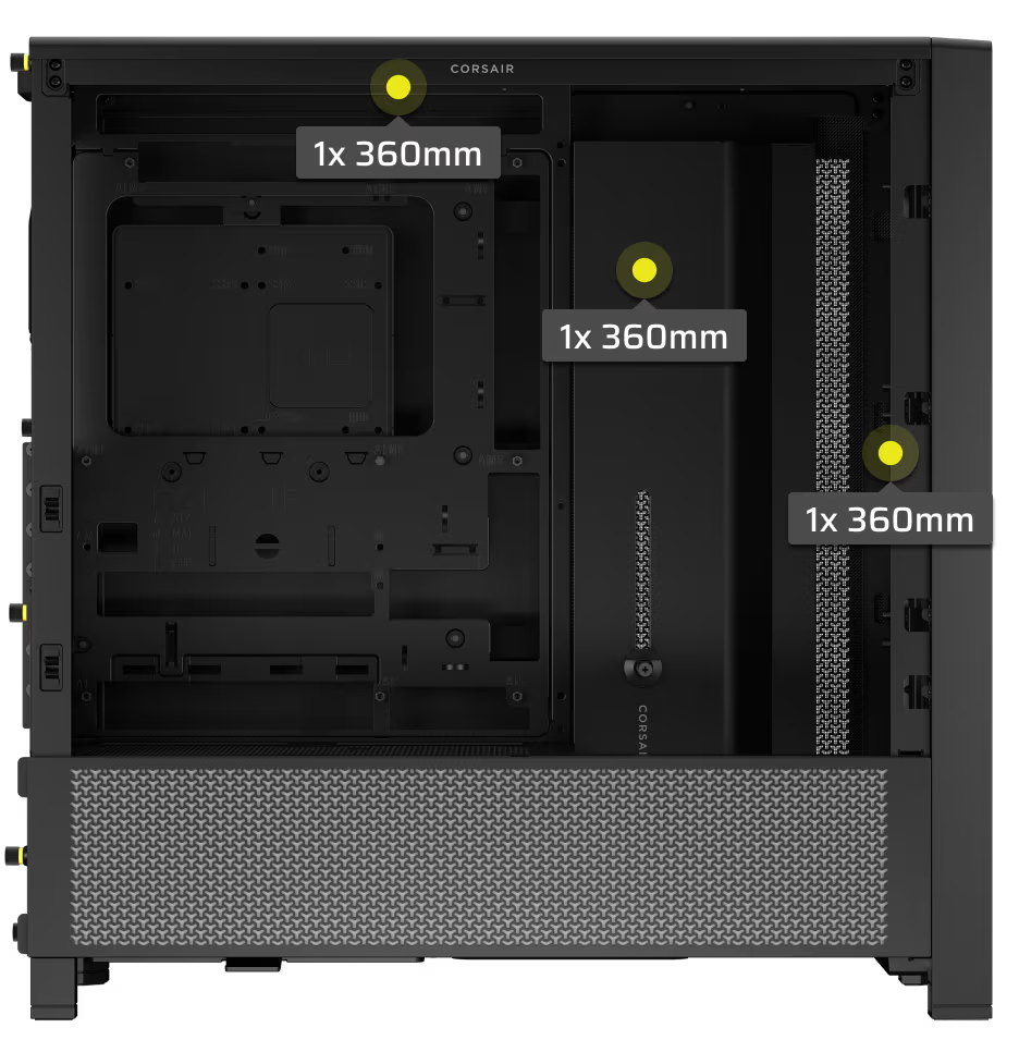 שפרו את הקירור עם שלושה מיקומי התקנה ייעודיים לרדיאטורים בגודל 360 מ"מ – בקדמת המארז, בתקרה ובצד. ניתן להתקין עד 10 מאווררי 120 מ"מ במקביל, כדי לשמור על זרימת אוויר רציפה ופינוי חום יעיל.