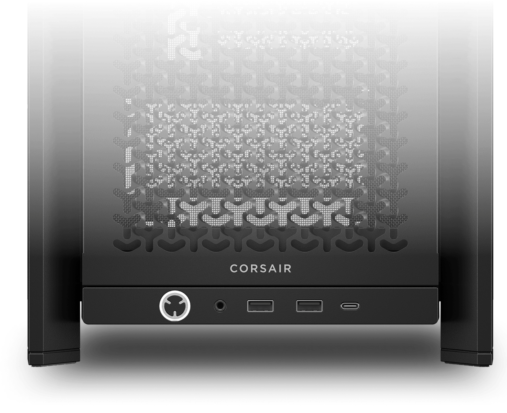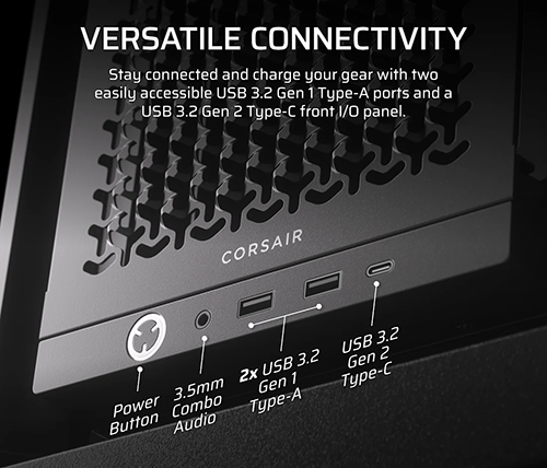 פאנל קדמי נוח לגישה הכולל חיבור USB 3.2 Gen2 Type-C, שני חיבורי USB 3.2 Gen1 Type-A, ושקע משולב לאוזניות/מיקרופון.