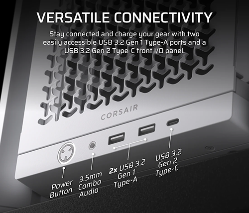 פאנל קדמי נוח לגישה הכולל חיבור USB 3.2 Gen2 Type-C, שני חיבורי USB 3.2 Gen1 Type-A, ושקע משולב לאוזניות/מיקרופון.