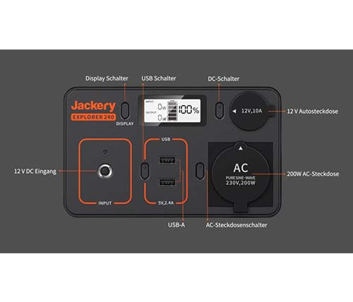הסוללה התעשייתית מסוג ליתיום ניקל מנגן קובלט אוקסיד (NMC) של תחנת הכוח הניידת Jackery Explorer 240 ידועה באורך החיים הארוך שלה. הצג החכם מציג את עוצמת הכניסה/היציאה ואת מצב הסוללה הנותר, מה שמקל על ניטור מצב הסוללה ובריאותה.