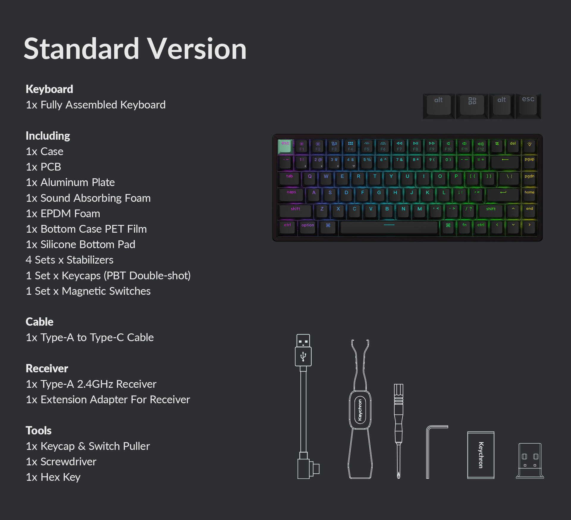 הגרסה הסטנדרטית כוללת מקשי PBT דו-שכבתיים בפרופיל Cherry עם תאורה שקופה ומסגרת אלומיניום.