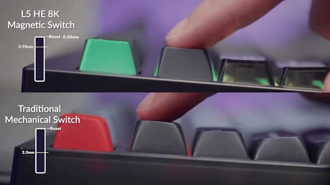 מקלדת בפריסת 75% הניתנת להתאמה אישית עם מתגים מגנטיים – ה־L5 HE מציגה פריצת דרך טכנולוגית – במקום מגעים פיזיים, המתגים המגנטיים משתמשים בחיישנים מגנטיים למדידת עומק לחיצה, ומעניקים לכם שליטה מוחלטת על תגובת כל מקש.