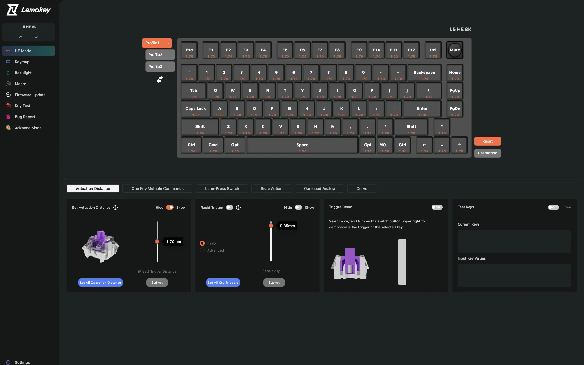 התאימו אישית כל מקש בדיוק מרבי, על ידי כוונון נקודת ההפעלה מ־0.01 ועד 3.35 מ״מ, עם רגישות של 0.01 מ״מ. הגדירו לחיצות שטחיות לביצוע פעולות מיידיות ולחיצות עמוקות לפעולות מכוונות – כך תצמצמו טעויות בלחיצה ותשיגו יתרון גם במשחק וגם בהקלדה.