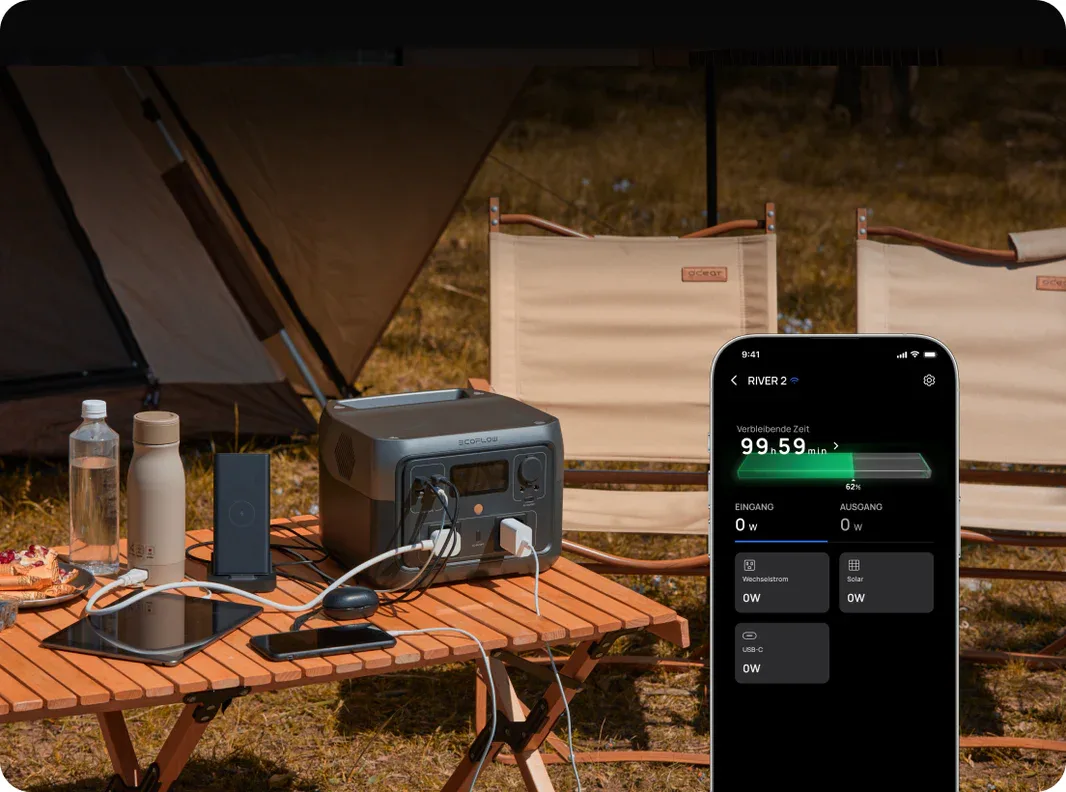 שליטה בכף היד. השתמש באפליקציית EcoFlow כדי לשלוט ולנטר את RIVER 2, אפילו מרחוק. הצג את רמות הטעינה, התאם אישית הגדרות והתאם את מהירויות הטעינה, הכל מהנוחות של הטלפון שלך.