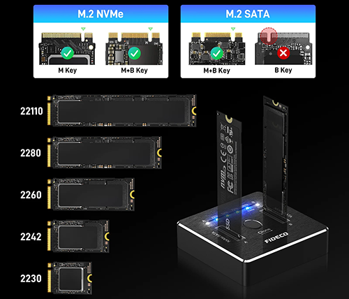 תחנת העגינה תומכת בכונני SSD מסוג M.2 PCIe NVMe עם מפתח M-Key או M+B Key, ובכונני M.2 SATA עם M+B Key. גדלי הכוננים הנתמכים הם: 2230 / 2242 / 2260 / 2280 / 22110. תחנה אחת בלבד מספיקה לצרכים של שימוש בכוננים בגדלים שונים.