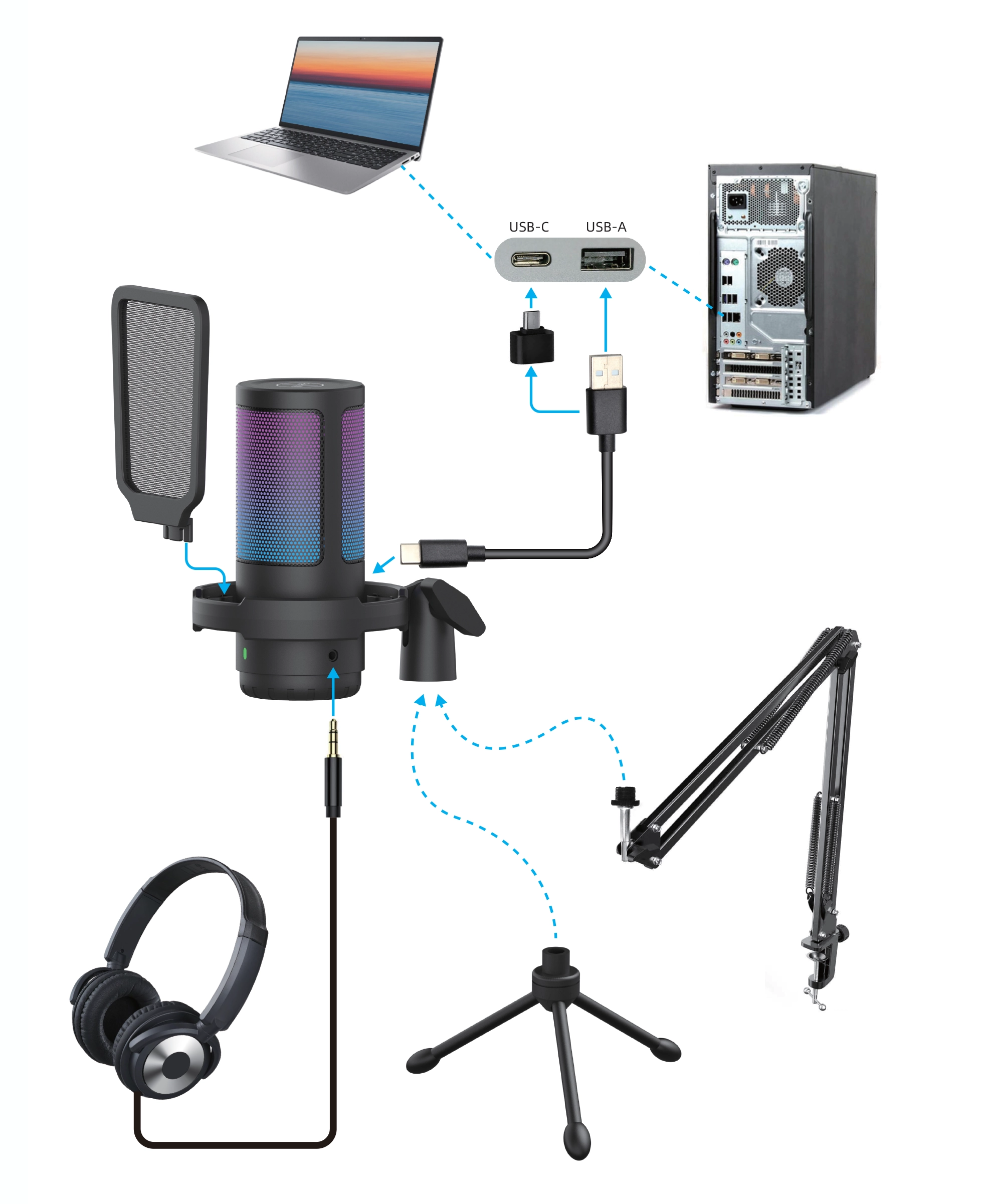 מתאים לגיימינג עם חברים, אולפנים ביתיים, שיעורי/הרצאות זום, הסכתים (פודקאסטינג). מגיע עם טריפוד וזרוע מתכווננת לשולחן המחשב או פינת הגימיינג.