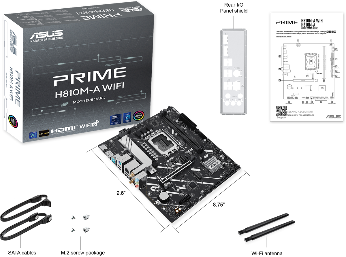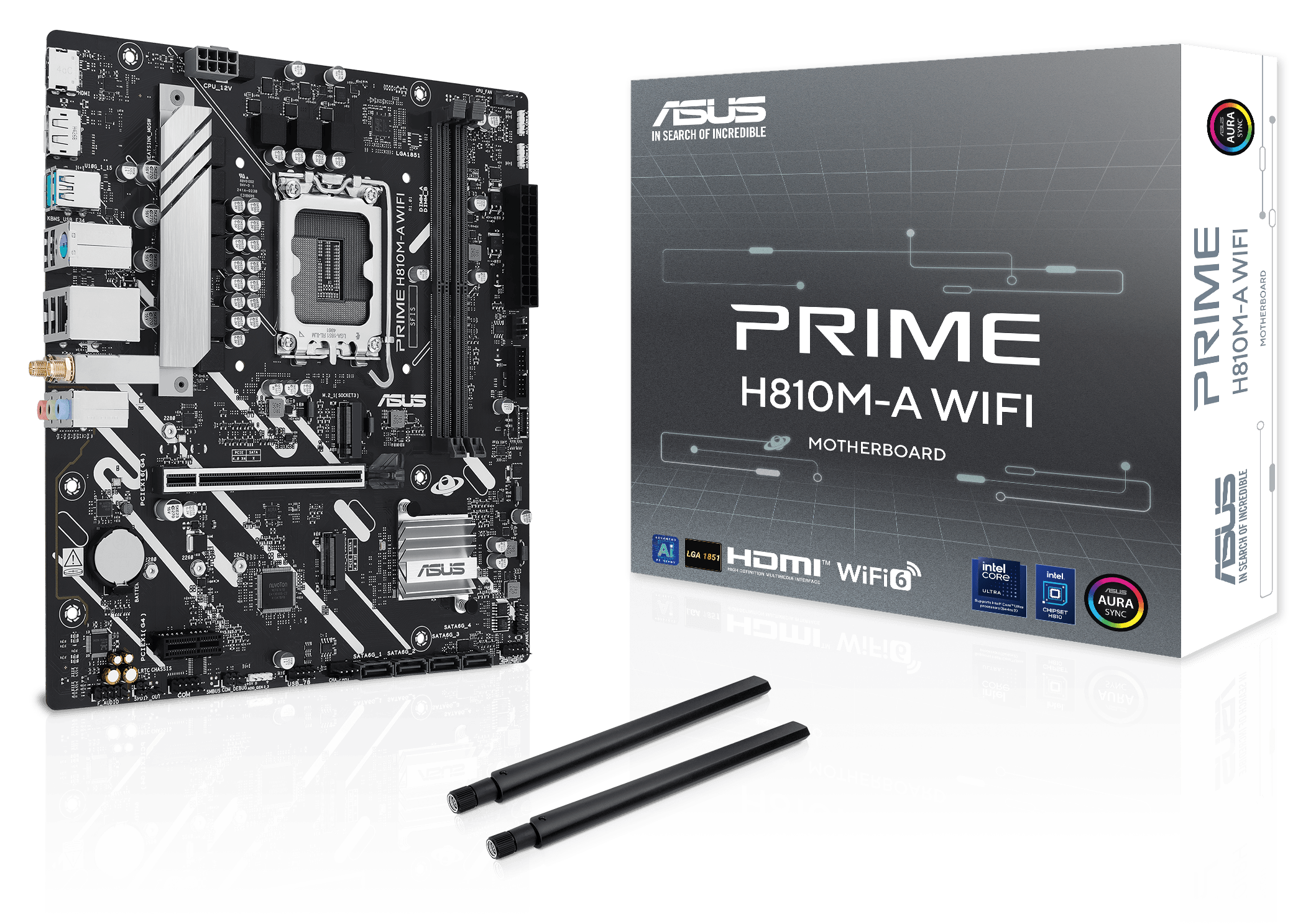 לוח אם Asus PRIME H810M-A WIFI, ערכת שבבים H810, תושבת 1851 למעבדי Intel Core Ultra דור 2, קישוריות Wi-Fi 6 ו-Bluetooth 5.3, כרטיס רשת קווי Intel 1Gb Ethernet, חיבורי USB 10Gbps ו- USB 2.0