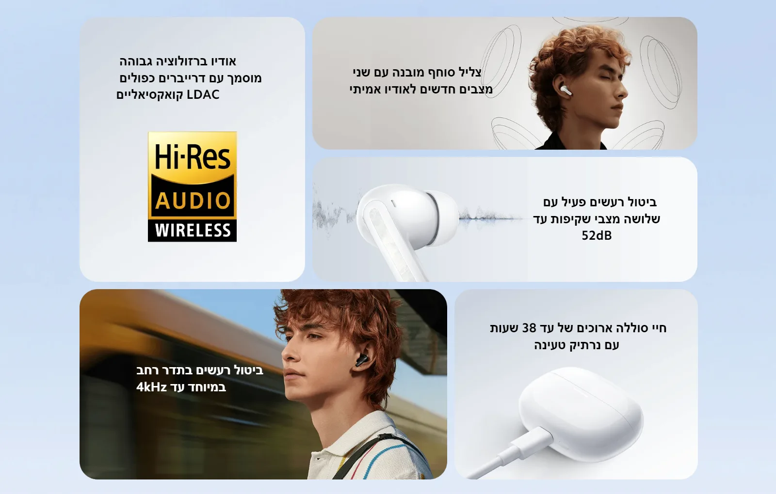Redmi Buds 5 Pro מאושר על ידי Hi-Res Audio Wireless ותומך ב-codec שמע LDAC עם קצב דגימה של עד 24bit/96kHz*, המאפשר שמע Ultra HD עם עיוות מינימלי.