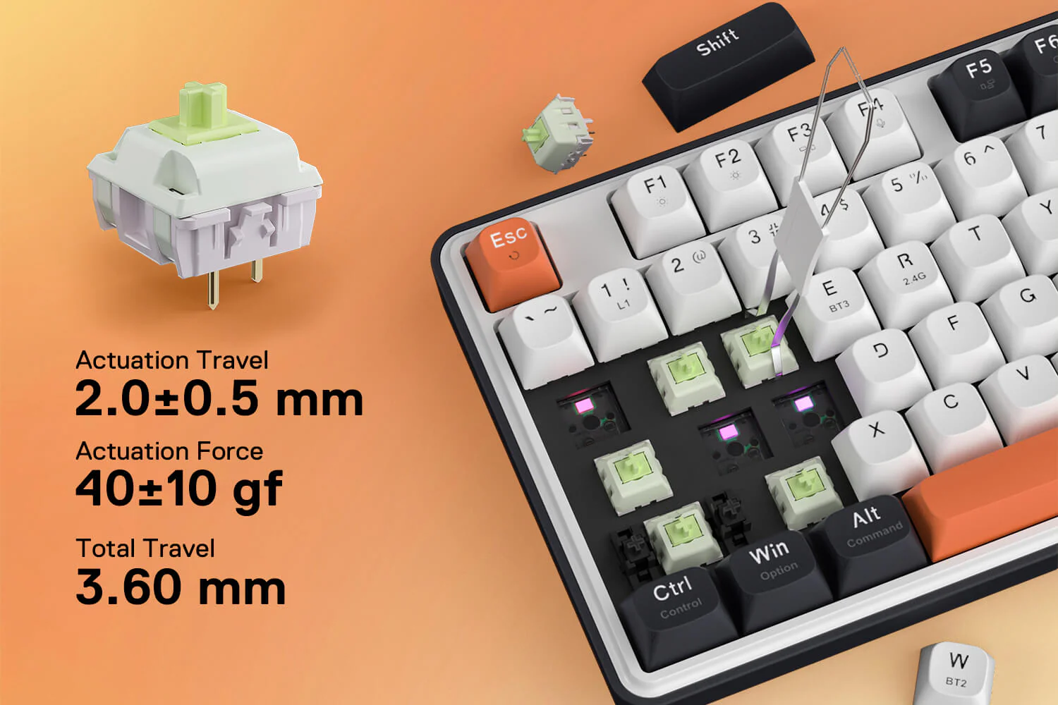 מתגים ליניאריים מותאמים עם סיכה עבה ומשומנת בשילוב מבנה Gasket מעניקים תנועה חלקה ועשירה עם תחושת הקלדה רכה, קרמית ונעימה. השקע המשודרג תומך כמעט בכל סוגי המתגים (3 או 5 פינים).