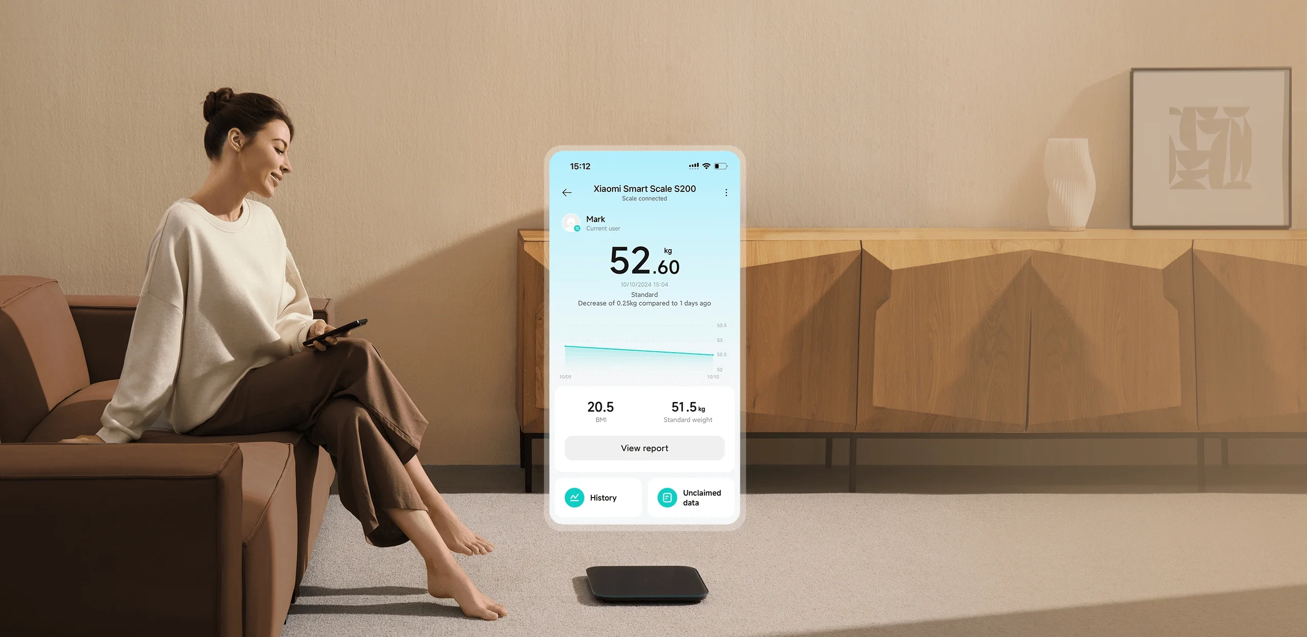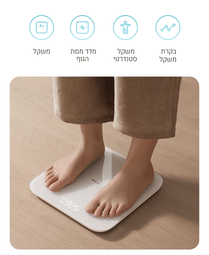 ה-Xiaomi Smart Scale S200 לא מודד רק את המשקל, ה-BMI* ומדדי גוף נוספים בזמן אמת, אלא גם מחשב את המשקל האידיאלי בהתאם לגובה ולגיל ומספק המלצות לניהול המשקל להפחתת סיכונים בריאותיים הנובעים מדיאטות לא בריאות ואיבוד משקל קיצוני.