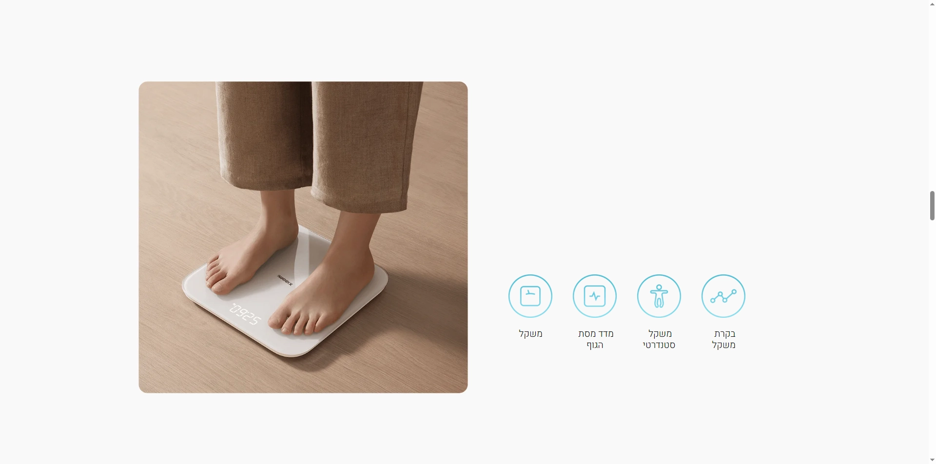 חפצים קטנים: חפצים במשקל בין 0.1 ק"ג ל-10 ק"ג. דיוק המשקל הוא 0.05 ק"ג והמשקל המינימלי הניתן למדידה הוא 0.1 ק"ג. עבור חפץ קטן במשקל ≤5 ק"ג, יש לעמוד תחילה על המשקל כדי להפעילו. החפץ ניתן להניח על המשקל לאחר שהתצוגה מראה 0.0 ק"ג. חפצים במשקל >5 ק"ג ניתן להניח ישירות על המשקל.