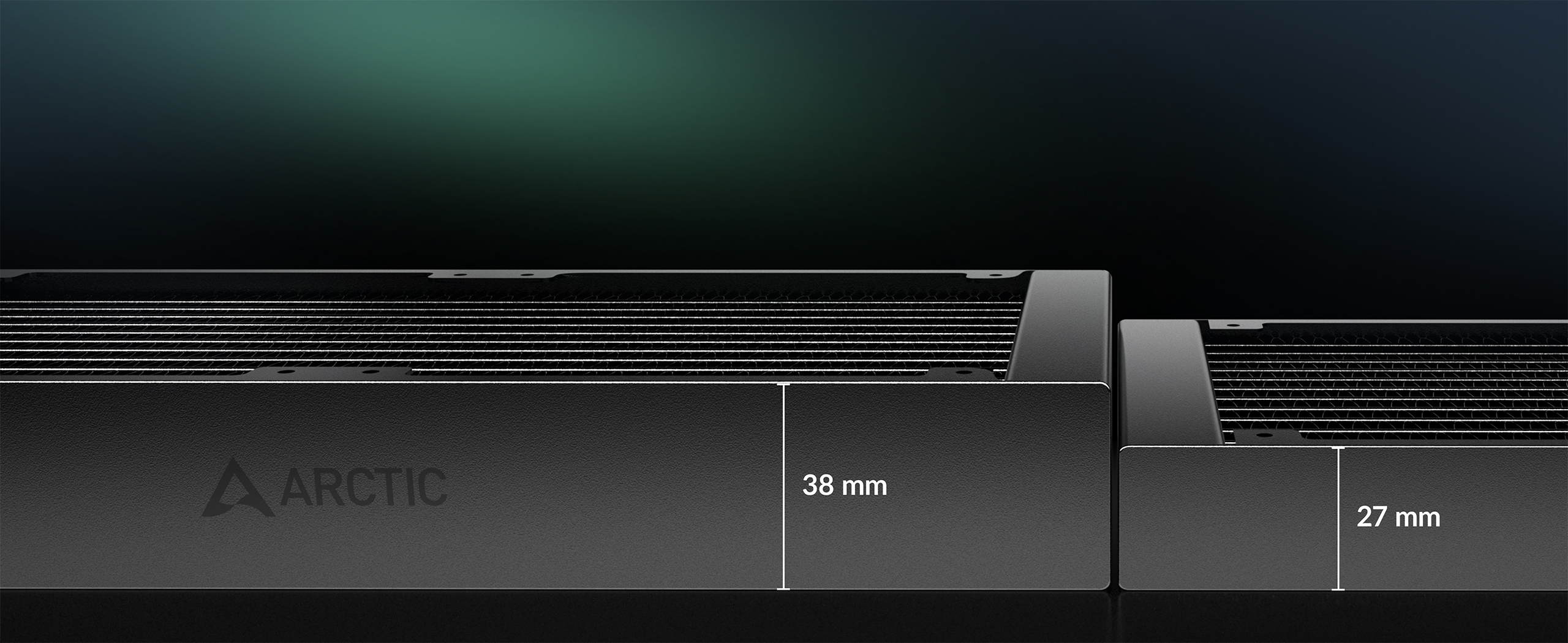 רדיאטור בעובי 38 מ"מ משפר את פיזור החום ומכיל יותר נוזל לעומת רדיאטורים בעובי 27 מ"מ – מה שמפחית חום עודף ומסייע בטיפול בקפיצות טמפרטורה ביעילות גבוהה יותר.