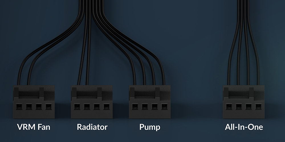 באמצעות כבל מפצל ניתן לשלוט בנפרד על המשאבה, מאוורר ה-VRM והמאווררים של הרדיאטור, או לסנכרן את כולם עם אות PWM יחיד באמצעות כבל All-in-One.
